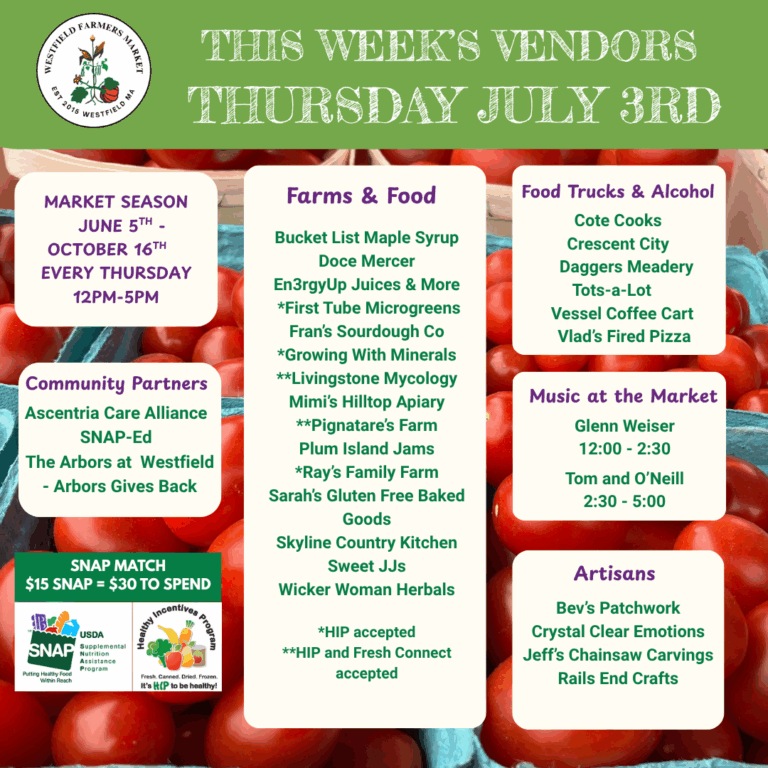 SNAP shoppers, a reminder that HIP benefits have been refreshed for July and increased to $40/month.  And if you need inspiration for using all the fruits and veggies you’ll find at the market this week, visit Ascentria SNAP-Ed’s tent and pick up some free recipes.