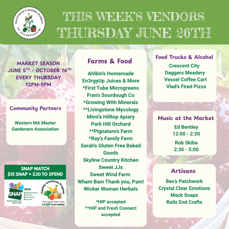 This week marks the end of the first month of the Market. The weather has warmed, veggies and fruits are beginning to flourish, and WFM is in full swing! Stop by for fresh produce, sourdough bread, gluten-free baked goods, hand-made vegan soap, silver jewelry, organic juice, pickles and relish, frozen lemonade, snow cones, pizza, and more! Remember to use your June HIP benefits before the month ends.