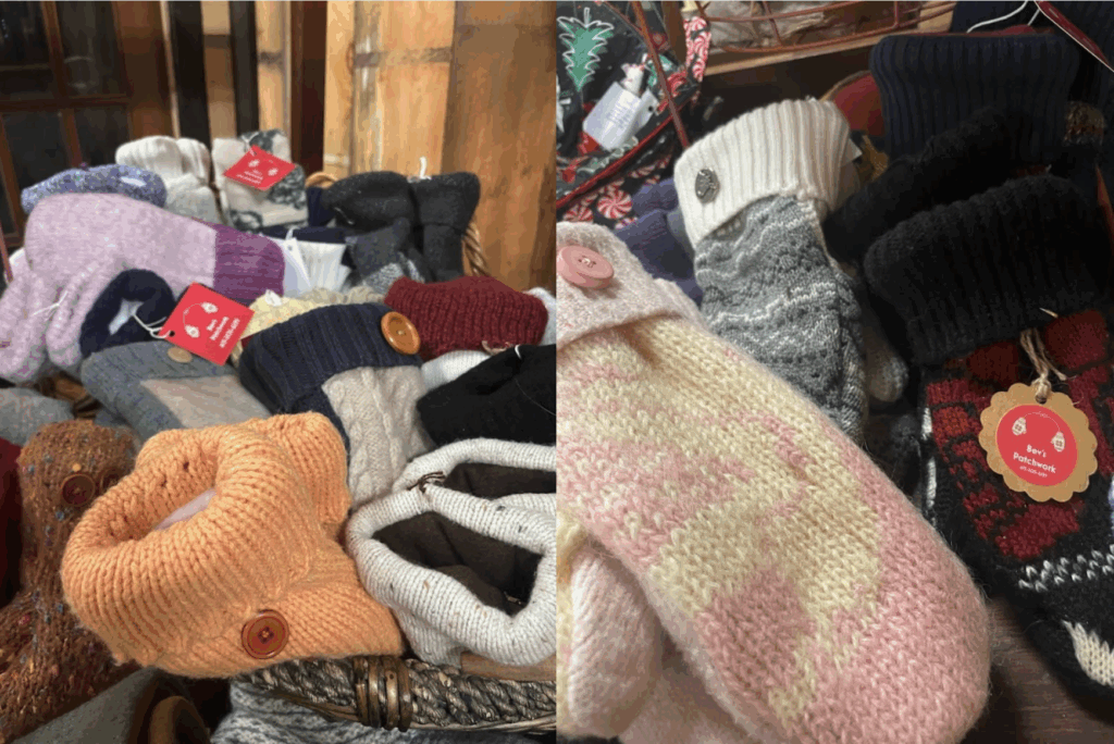 Hand made with love - aprons, bowl cozy’s, hot pads, pillows, wine totes, tote bags, headbands, tea bag wallets, hobby horses and mittens from recycled wool sweaters. Be sure to check out the lovely mittens pictured above, perfect for the fall weather and upcoming winter!